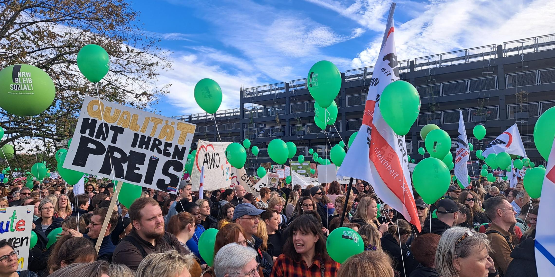 Mehr als 20.000 Menschen haben am Donnerstag vor dem Düsseldorfer Landtag für den Erhalt sozialer Infrastruktur wie Kitas und schulischen Ganztagsangeboten demonstriert. Nach Angaben von Polizei und Veranstaltern wurde die ursprünglich erwartete Besucherzahl damit um das Vierfache übertroffen. Auch wir von der Caritas Oberberg waren mit knapp 40 Mitarbeiter/-innen dabei.